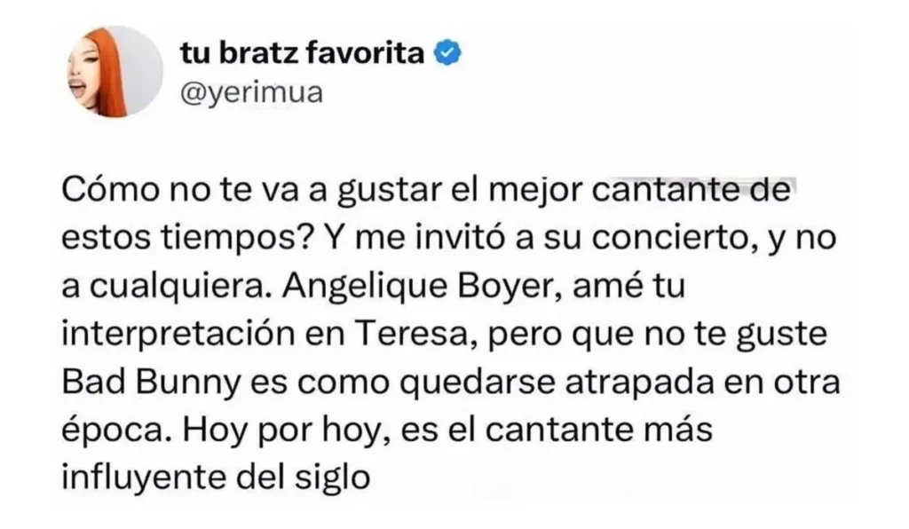 Aunque sus declaraciones ya habían generado debate, la polémica tomó mayor fuerza tras la reacción de la influencer Yeri MUA, quien salió en defensa del cantante y expresó abiertamente su desacuerdo con Angelique Boyer. La creadora de contenido aseguró que Bad Bunny es “el mejor cantante del siglo” y destacó su experiencia personal al asistir a uno de sus conciertos.