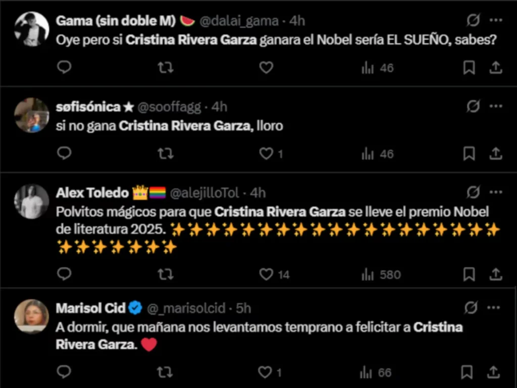 Rivera Garza, nacida en Matamoros, Tamaulipas, ha sido reconocida por una obra que cruza fronteras literarias y aborda temas como la identidad, la violencia de género y la memoria social. Su reciente ingreso a El Colegio Nacional reforzó su posición como una de las voces más influyentes de la literatura mexicana contemporánea, motivo por el cual figuraba en sitios de apuestas como Nicer Odds y Ladbrokes entre las favoritas al Nobel.