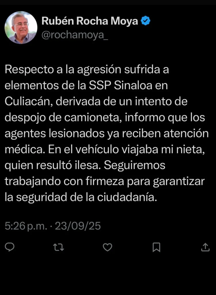 A través de su cuenta de X, el gobernador Rubén Rocha Moya, informó que en la camioneta que intentaron despojar a agentes de la Secretaría de Seguridad Pública, del área de Servicios de Protección, viajaba su nieta, la cual resultó ilesa.