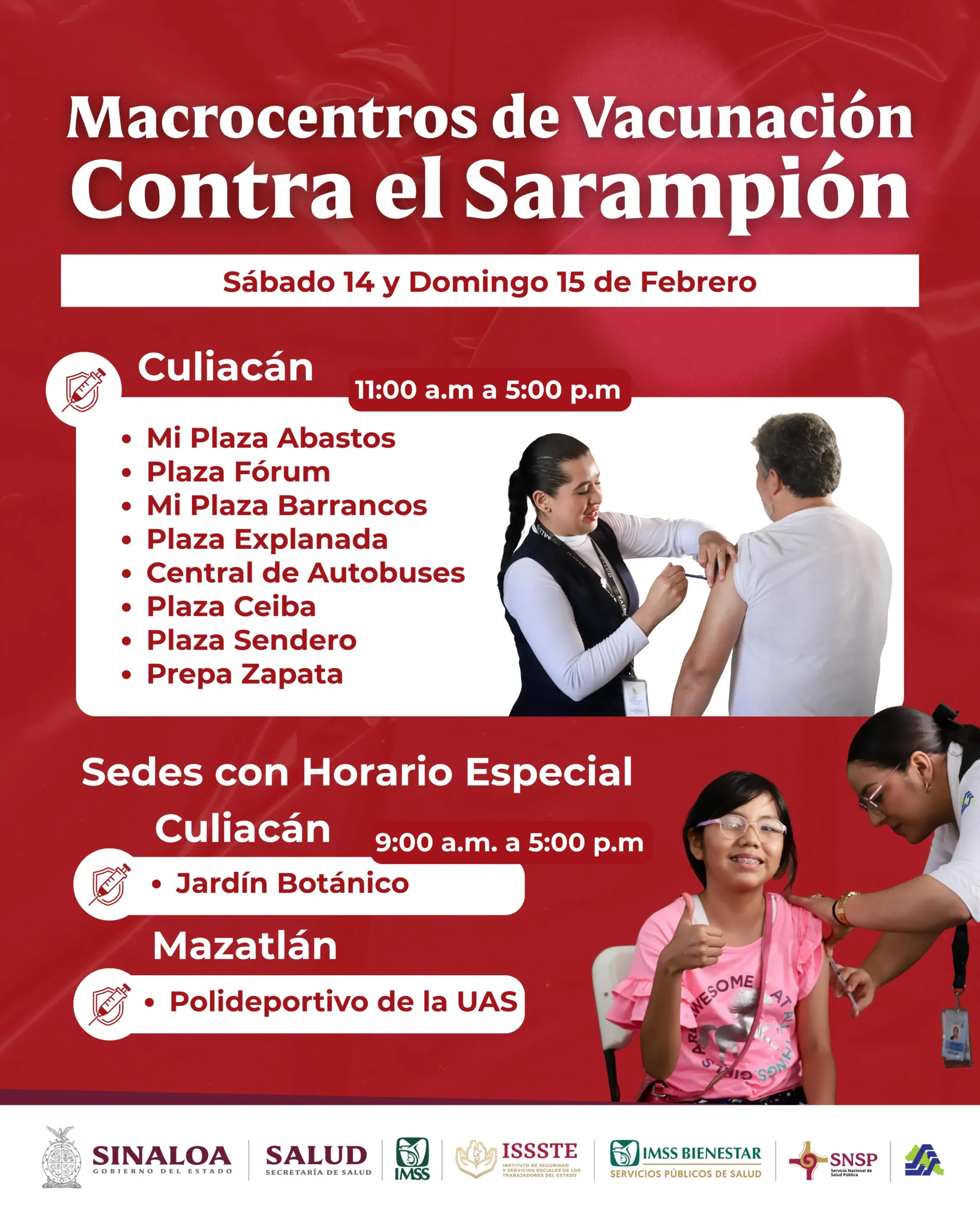 Culiacán, Sinaloa, 12 de febrero del 2026.- ¿Aún no tienes planes para este 14 de febrero Día de San Valentín? La Secretaría de Salud de Sinaloa te invita a que te vacunes contra el sarampión en los macrocentros que se instalarán en diferentes puntos de Culiacán y Mazatlán.