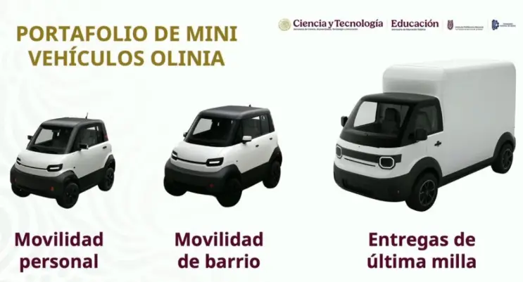 Olinia contará con tres modelos iniciales enfocados en diferentes necesidades de movilidad urbana: un auto compacto para uso personal y traslados cotidianos, un modelo tipo mototaxi para distancias cortas en barrios y comunidades, y un vehículo de “última milla” diseñado para entregas y logística ligera. Todos los modelos se desarrollan con tecnología e ingeniería nacional.
