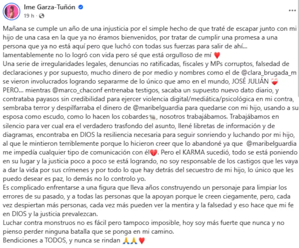 Imelda Garza-Tuñón acusó públicamente en redes sociales a Clara Brugada, jefa de Gobierno de la Ciudad de México, así como a Maribel Guardia y Marco Chacón, de estar involucrados en lo que calificó como el “secuestro” de su hijo, José Julián. El pronunciamiento se dio a un año de la resolución judicial que otorgó la custodia del menor a la actriz costarricense.