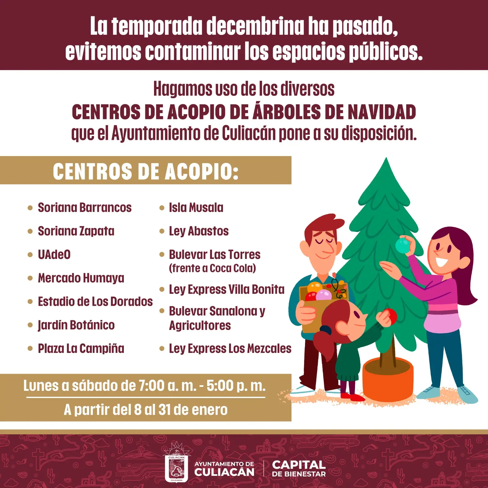 Culiacán, Sinaloa.- Con Centros de Acopio, distribuidos en la ciudad, el área de Servicios Públicos del Ayuntamiento de Culiacán, busca facilitar a ciudadanos deshacerse de sus árboles naturales de navidad, informó Luis Alfonso Arce Arias, director de Servicios Públicos en Culiacán.