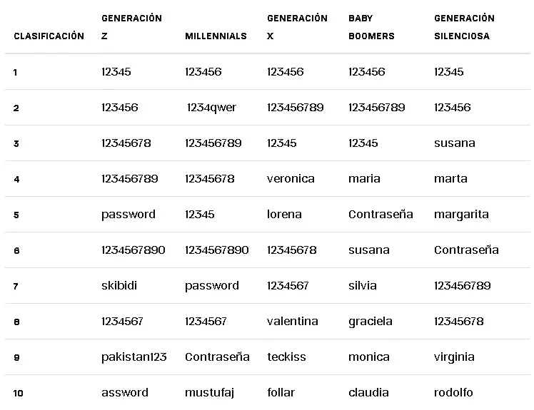 El análisis por generaciones derriba otro mito común: que los jóvenes son más cuidadosos con su seguridad digital. La generación Z, por ejemplo, evita nombres propios, pero abusa de largas secuencias numéricas; mientras que adultos mayores prefieren combinaciones de palabras simples o nombres. En ambos casos, los atacantes conocen estos atajos y los usan a su favor. La realidad es que ningún grupo generacional está creando contraseñas verdaderamente robustas.