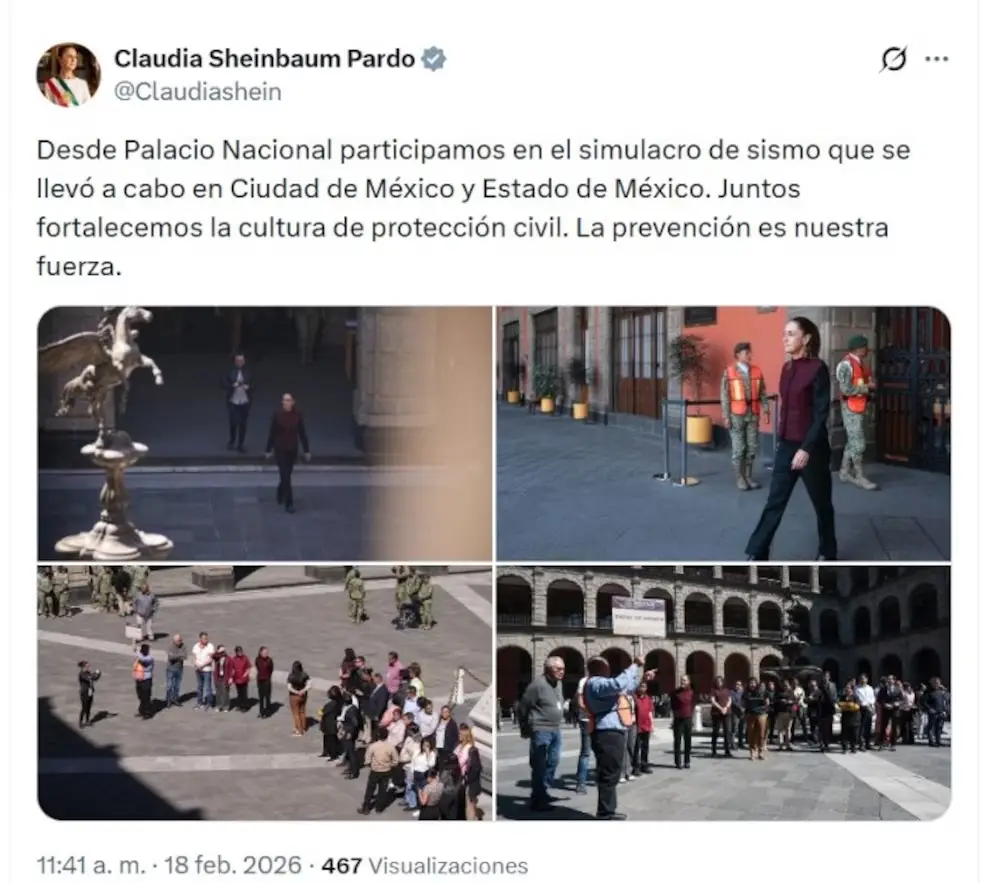 En su cuenta de X, la mandataria publicó diversas fotografías del momento del simulacro en Palacio Nacional, recordando la importancia de fortalecer la cultura de Protección Civil.