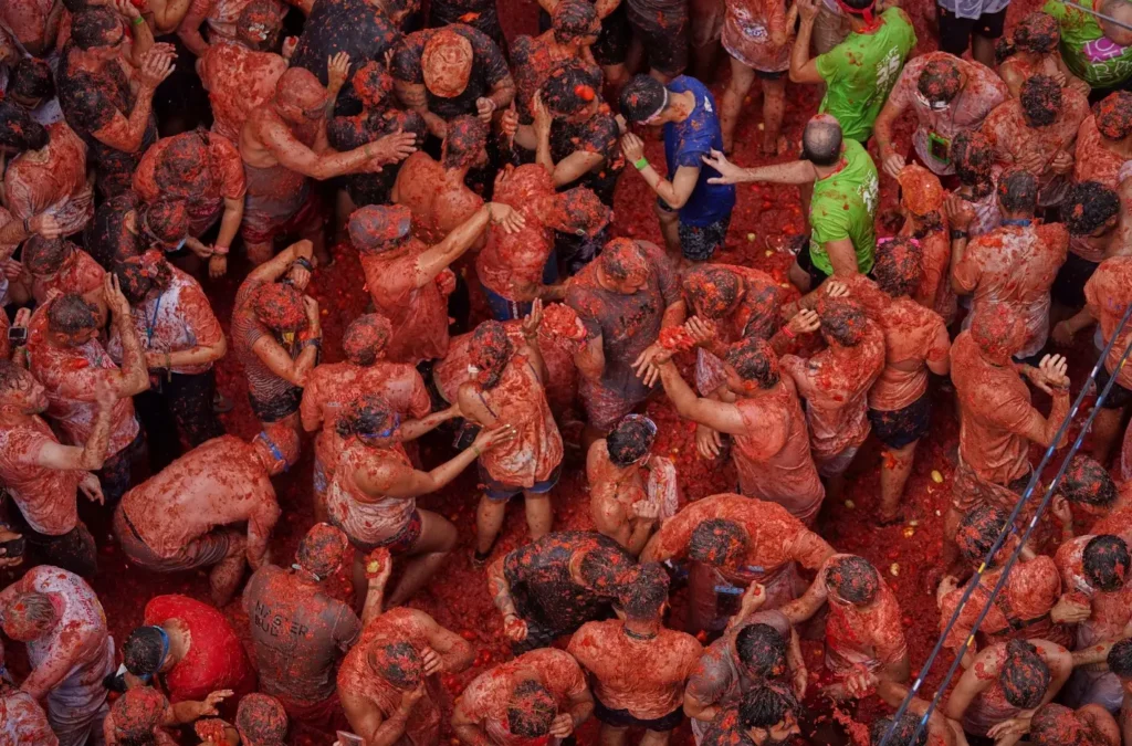 Miles de personas de distintas partes del mundo se reunieron en Buñol, España, para participar en la tradicional “Tomatina”, una fiesta que cada año transforma las calles en un mar rojo de pulpa y risas. Durante una hora, unos 20 mil asistentes lanzaron 120 toneladas de tomates demasiado maduros, en medio de música, euforia y un ambiente comparable al de un festival de música electrónica.