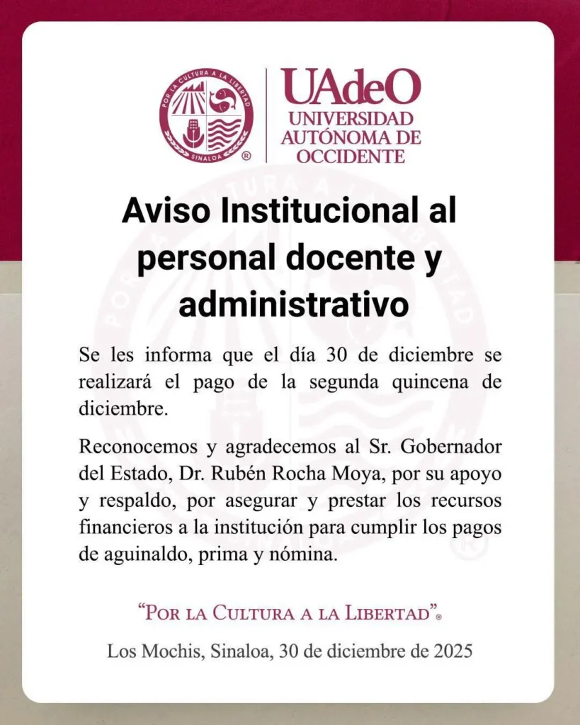 La Universidad Autónoma de Occidente (UAdeO) informó a su personal docente y administrativo que este día se realizará el pago correspondiente a la segunda quincena de diciembre, cumpliendo así con los compromisos laborales de cierre de año.