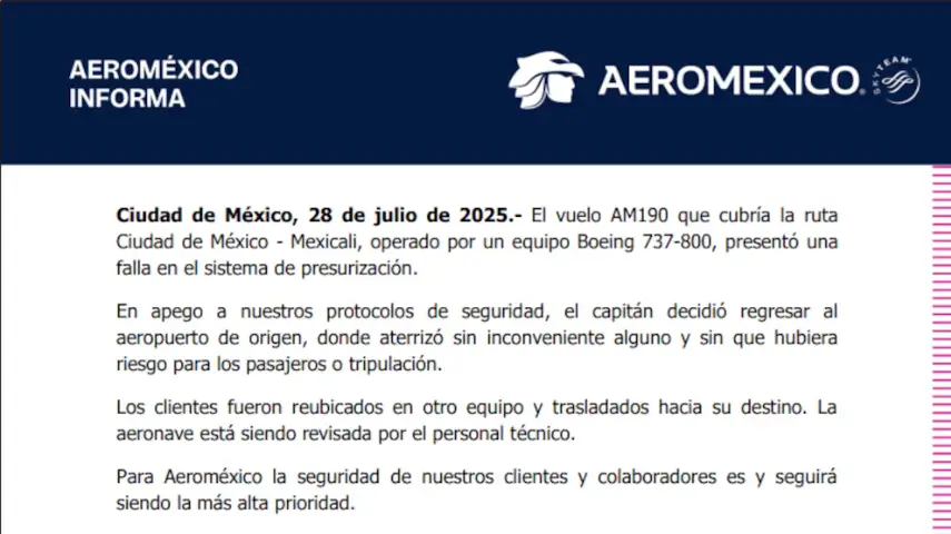 Aeroméxico informó que su vuelo AM190, con destino a Mexicali desde la Ciudad de México, tuvo que regresar de emergencia al Aeropuerto Internacional de la Ciudad de México este lunes, luego de que se detectara una falla en el sistema de presurización aproximadamente 35 minutos después del despegue. El avión, un Boeing 737-8JP con matrícula XA-PPP, activó los protocolos de seguridad cuando se desprendieron las mascarillas de oxígeno dentro de la cabina.